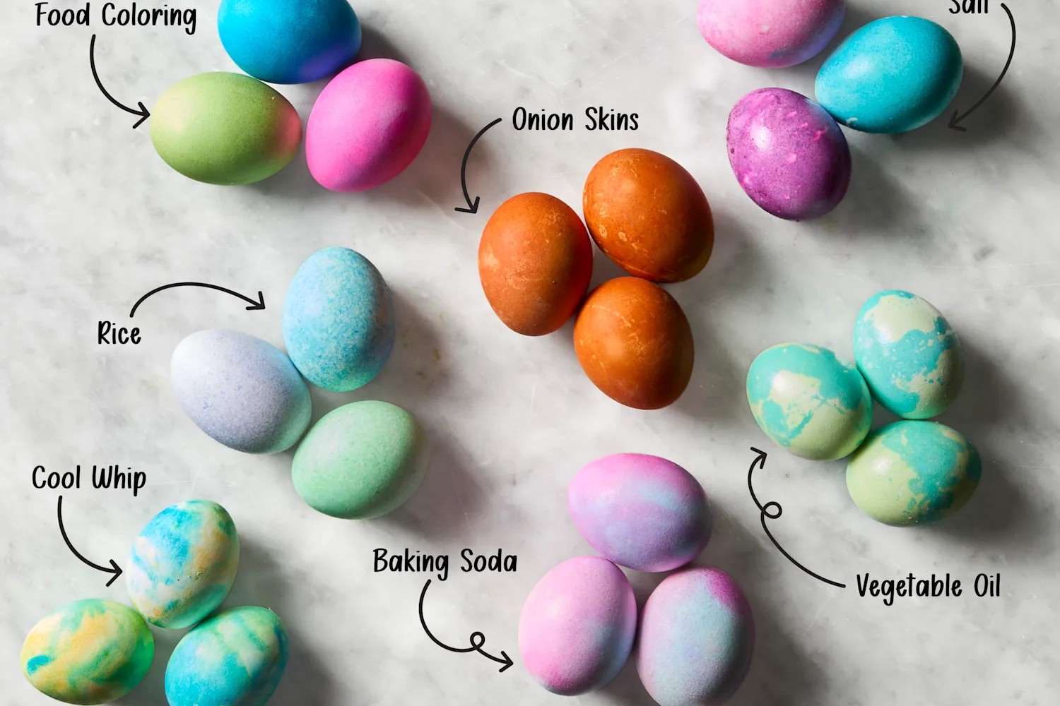Ця несподівана техніка передбачає покриття яєць збитими вершками та нанесення на них харчового барвника. Розведення кольорів шпателем створює ефект, що завихрюється. Охолодження протягом 30 хвилин або довше закріплює барвник. Результатом є чарівний мармуровий малюнок, що нагадує планетарні види. Процес напрочуд ефективний, даючи яскраві, унікальні яйця.
