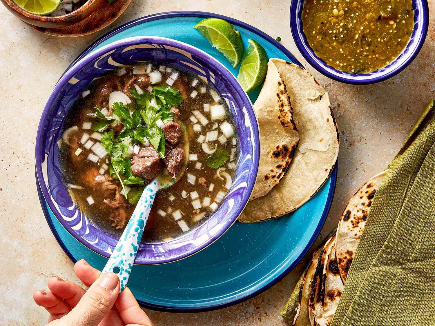 - Consomé: Chutný vývar obohacený limetkou, koriandrem a cibulí. Dá se popíjet mezi sousty, použít k namáčení nebo vychutnat jako lehkou polévku.